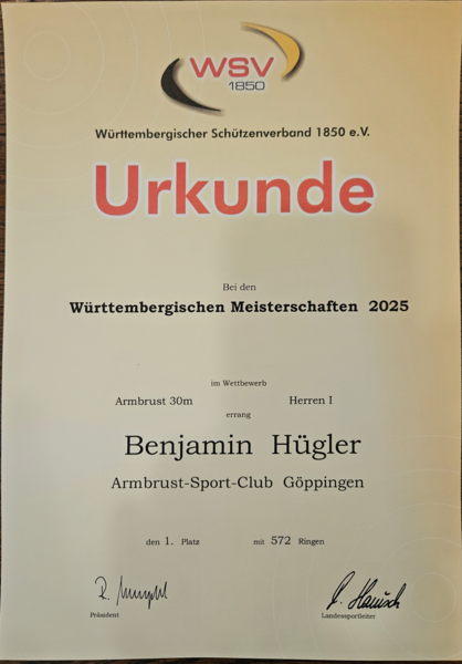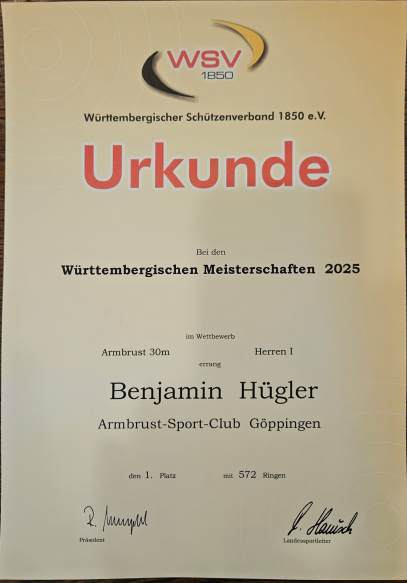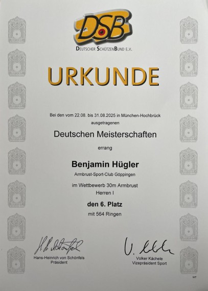 In der Königsklasse der Armbrustschützen, der 30m Armbrust, konnten wir aufgrund der Nachwuchsplanung keine Mannschaft stellen. Aber Benjamin Hügler vertrat eindrucksvoll den ASC Göppingen. Mit starken 564 Ringen belegte er am Ende den 6.Platz