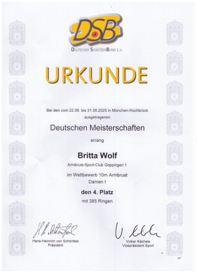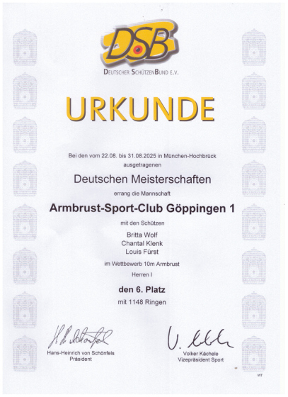 Bei den Deutschen Meisterschaften haben unsere Schützen mit sehr guten Ergebnissen geglänzt. Auch wenn es dieses Jahr für keine Medaille gereich hat, sind wir richtig stolz auf euch. Britta Wolf belegte in der Damenklasse den 4.Platz. Chantal Klenk ( in anderen Umständen ) belegte den 17.Platz. Maren Windhab erreichte den 34.Platz. In der Herrenklasse konnte unser Louis Fürst den 5.Platz erringen. Mit der Mannschaft belegten sie am Ende einen guten 6.Platz.