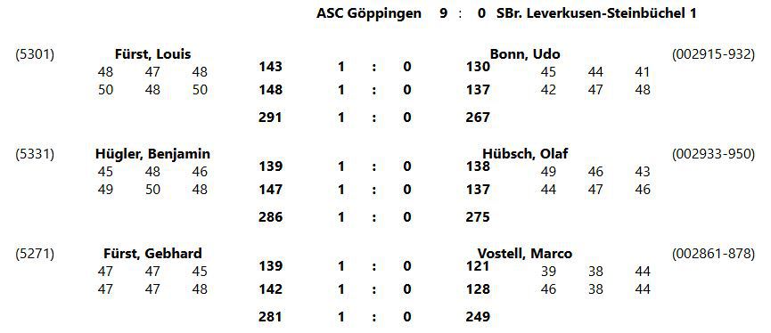 mit einem 9:0 Erfolg gegen den Leverkusen-Steinbüchel, konnten wir die Tabellenführung mit 8:0 Punkten sichern .